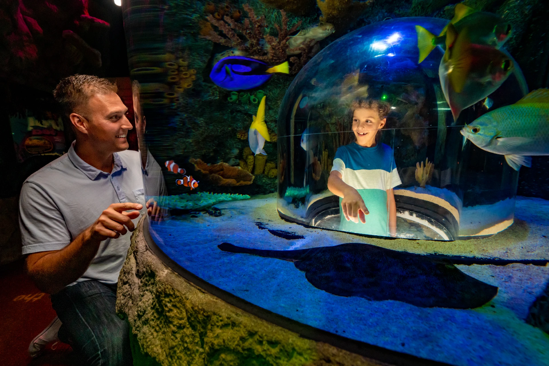 The aquarium features various special sections and exhibitions for everyone to enjoy. Be sure to walk through the only 360° Ocean Tunnel in Florida to discover everything that lives at the bottom of the ocean! Walk through the tunnel as fish, sharks, eels and turtles swim around you. Don’t forget to wave hello to Joy, our beloved zebra shark!